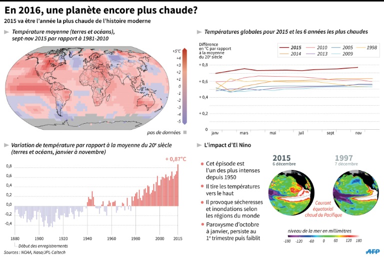 Les effets d'El Niño dépassent la région pacifique et ce phénomène "a une conséquence à l'échelle planétaire", explique à l'AFP Jean Jouzel, l'ancien vice-président du Groupe intergouvernemental d'experts sur l'évolution du climat (Giec) dont les travaux ont alerté le monde sur le réchauffement. "Généralement, les années El Niño sont des années plus chaudes que les valeurs moyennes", a-t-il ajouté.