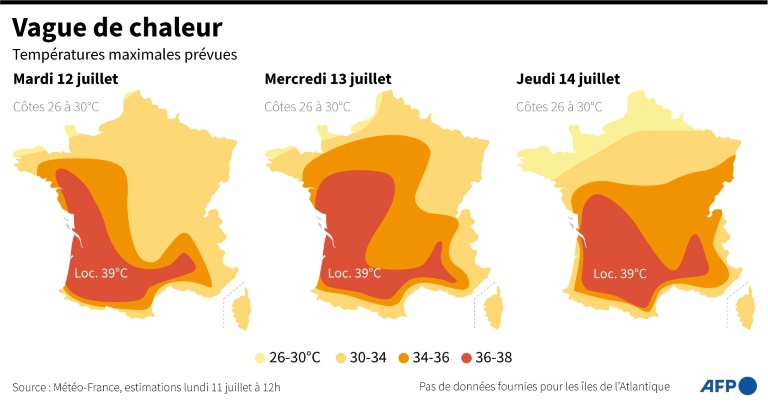 Cette vague de chaleur s'est également installée lundi sur la France depuis le sud-ouest du pays, a indiqué lundi Météo-France. Les températures dépassaient les 30°C sur une bonne partie du pays et pourraient dès mardi atteindre localement 39°C.