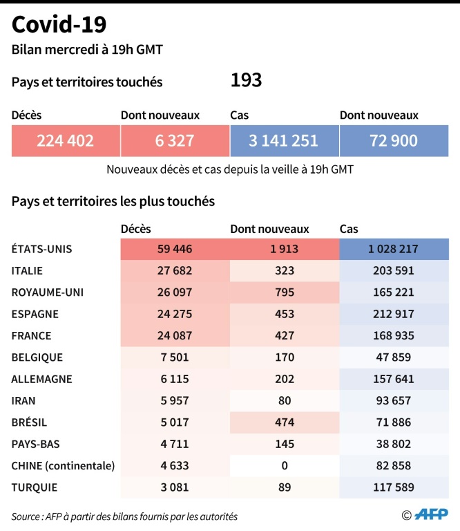 Le nombre de cas recensés sur la planète dépasse 3,1 millions, selon un bilan établi par l'AFP à partir de sources nationales, forcément inférieur à la réalité faute de tests suffisants.