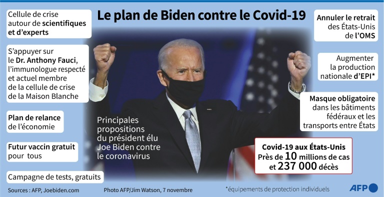 Comme dans une réalité parallèle, sans jamais mentionner ou presque le milliardaire et ses recours judiciaires, le président élu a commencé à préparer sa prise de fonctions. Le démocrate, qui fêtera dans dix jours ses 78 ans, a d'abord dressé lundi les contours de sa lutte contre la pandémie de Covid-19, sa priorité, le jour où les Etats-Unis ont franchi la barre des 10 millions de cas recensés de contamination.