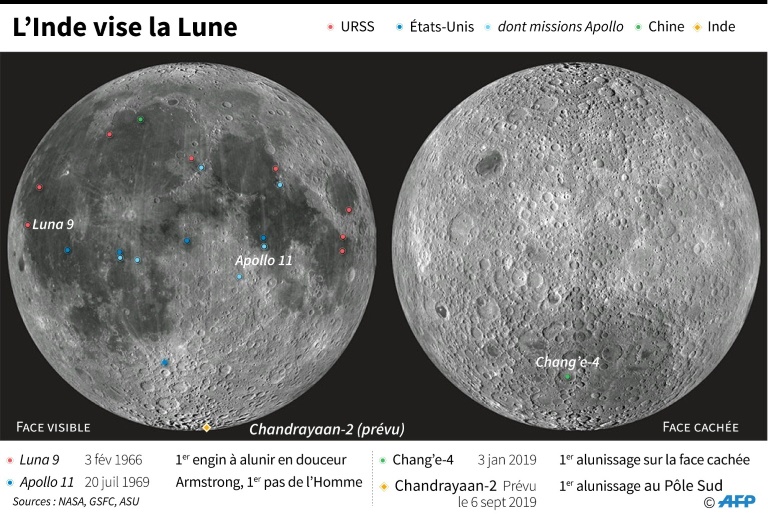 L'expédition inhabitée a pour but de poser le 6 septembre prochain un atterrisseur et un robot mobile près du pôle sud de la Lune, située à quelque 384.000 kilomètres de la Terre, ainsi que de placer une sonde en orbite lunaire. Si la mission est couronnée de succès, l'Inde deviendrait la quatrième nation à réussir à poser un appareil sur le sol sélénite, après l'Union soviétique, les États-Unis et la Chine. Une sonde israélienne a raté son alunissage en avril et s'est écrasée.