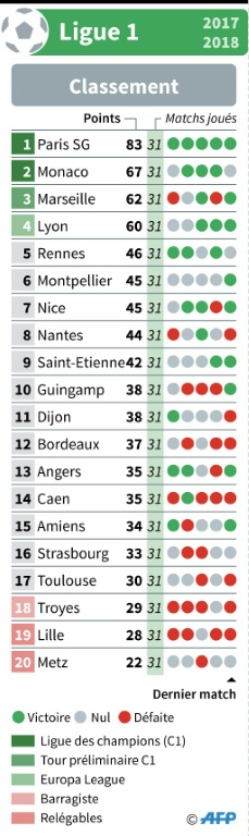 Pour la Ligue 1, ce pourrait donc être bouclé dès dimanche si Paris bat Monaco dans un stade où aucune équipe française ne l'a battu depuis... les Monégasques, en mars 2016 (2-0), alors que le PSG venait de remporter le 6e titre de champion de son histoire (après 1986, 1994, 2013, 2014 et 2015).