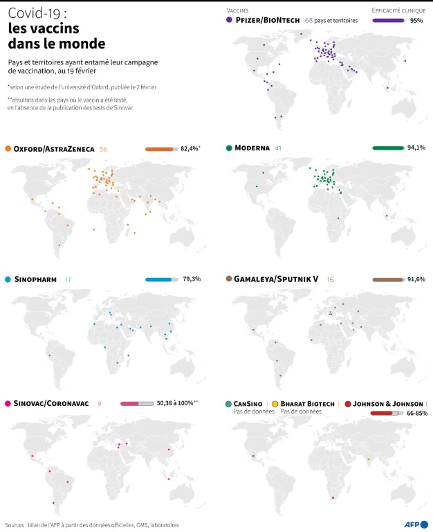 En valeur absolue, ce sont les Etats-Unis qui font la course en tête, avec 59,6 millions de doses administrées, devant la Chine (40,5 millions au 9 février), le Royaume-Uni (17,5 millions), l'Inde (10,7 millions) et Israël (7,1 millions).