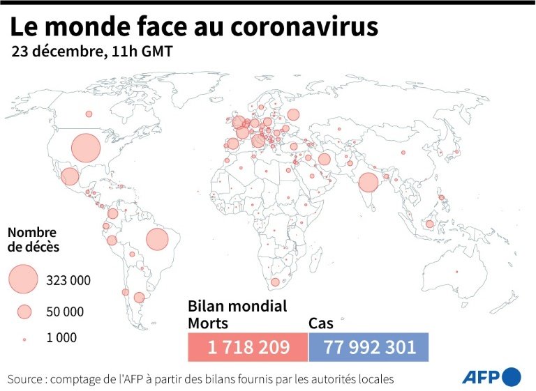 La pandémie a fait au moins 1.718.209 morts dans le monde, selon un bilan établi par l'AFP mercredi. Plus de 77.992.300 cas de contamination ont été officiellement diagnostiqués depuis le début de l'épidémie.