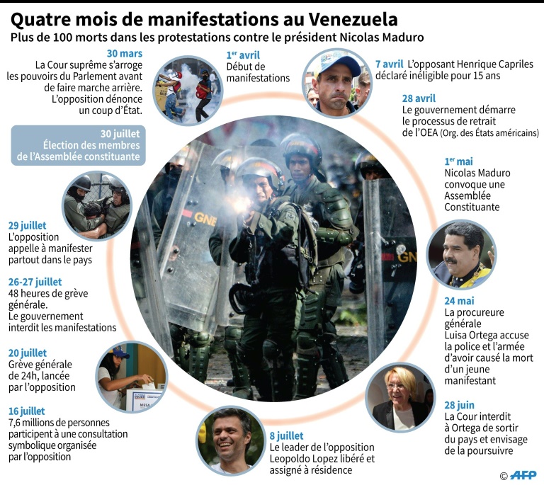 L'opposition maintenait samedi au Venezuela son appel à manifester malgré l'interdiction du gouvernement socialiste de Nicolas Maduro, inflexible sur la tenue dimanche d'un scrutin pour désigner une Assemblée constituante controversée dans ce pays où quatre mois de violences ont déjà fait 113 morts.
