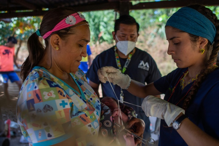 "Kotopa. Bien? Oncoma tasempe. (Douleur. Bien? Respire à fond)", dit-elle avec bienveillance, mélangeant langue enepa, apprise sur le tas, et espagnol, avant de poser une perfusion puis de suturer des lésions provoquées par l'accouchement. "C'est important de communiquer, de leur dire que ça va faire un peu mal. Les femmes ne parlent souvent pas espagnol", explique-t-elle, tandis qu'une infirmière habille le nouveau-né.