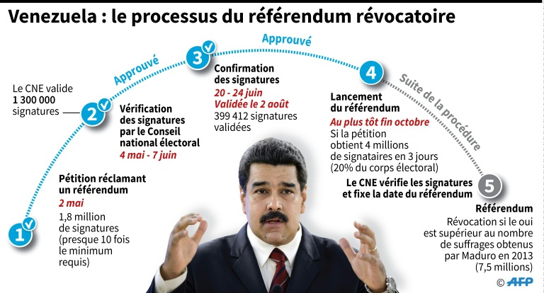 La dernière étape nécessaire avant d'organiser le référendum, c'est-à-dire la collecte de quatre millions de signatures en trois jours, n'aura lieu au mieux que fin octobre, a annoncé mardi la présidente du Conseil national électoral (CNE) Tibisay Lucena. Cet organisme est accusé par l'opposition de faire le jeu du pouvoir.