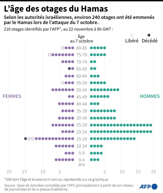 "La pause humanitaire débutera à 07H00 (05H00 GMT) vendredi", a déclaré le porte-parole du ministère qatari des Affaires étrangères, Majed Al-Ansari, indiquant que 13 otages femmes et enfants retenus dans la bande de Gaza seraient libérés "aux alentours de 16H00 (14H00 GMT) le même jour".