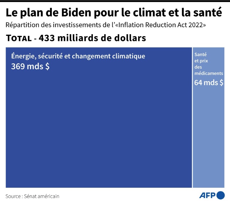 Le texte, qui doit mettre le pays sur la bonne trajectoire pour atteindre ses objectifs de réduction de gaz à effet de serre, sera promulgué par Joe Biden la semaine prochaine, a indiqué le président dans un tweet. "Aujourd'hui, le peuple américain a gagné", a écrit M. Biden. Avec cette loi, "les familles vont constater une baisse des prix des médicaments, des soins de santé, et des coûts de l'énergie."