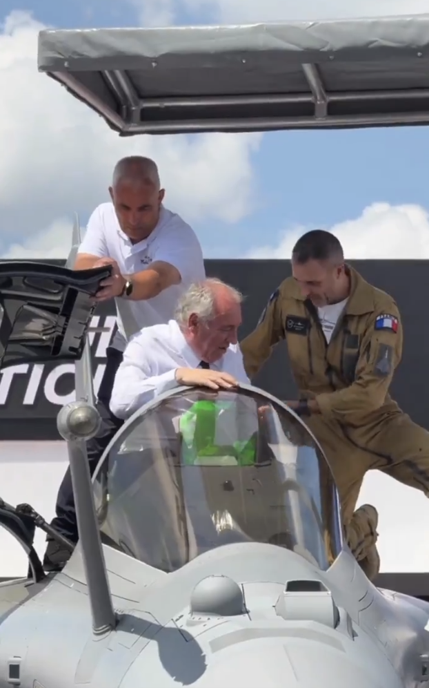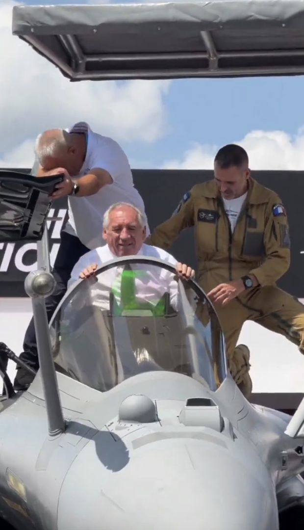 Ce mercredi 18 juin 2025, le Premier ministre François Bayrou a eu du mal à sortir du cockpit de rafale, aider par le pilote de l'engin. Regardez.