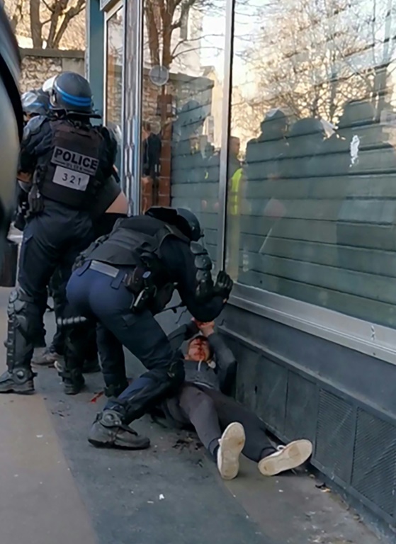 Sur les images diffusées sur les réseaux sociaux, le manifestant est allongé au sol devant l'armurerie de la gare de l'Est, le visage ensanglanté, quand le policier qui le maintient lui assène au moins deux coups de poing. Sur un autre angle de la scène, filmée par l'AFPTV autour de 14H30, l'homme, couché sur le ventre et déjà menotté, crie de douleur quand le policier lui appuie son genou sur le bras.