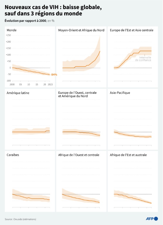 Les infections au virus de l'immunodéficience humaine (VIH) sont tombées en 2023 à leur plus bas niveau historique, dans une fourchette entre un million et 1,7 million, selon le bilan annuel publié mardi par l'agence Onusida.