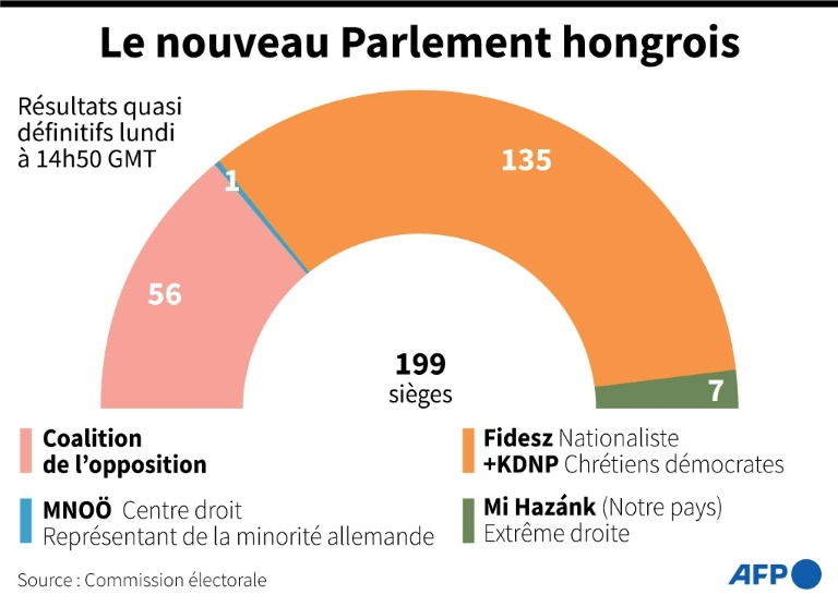 A l'ombre de la guerre voisine en Ukraine, qui a renforcé l'assise d'un Premier ministre se voulant garant de la stabilité, le parti au pouvoir Fidesz a remporté plus de 53% des voix (135 sièges) après le dépouillement de 99% des bulletins, contre moins de 35% (56 sièges) pour l'opposition, selon le Bureau national électoral.