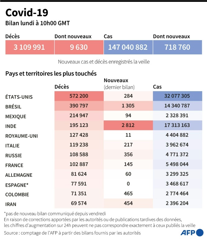 Le virus a fait au moins 3.109.991 millions de morts dans le monde depuis que le bureau de l'Organisation mondiale de la santé (OMS) en Chine a fait état de son apparition fin décembre 2019, selon un bilan établi par l'AFP à partir de sources officielles lundi.