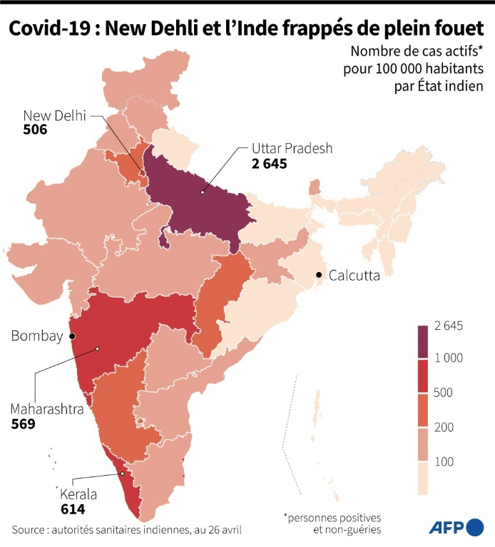 A New Delhi, des témoins décrivent des couloirs d'hôpitaux encombrés de lits et de brancards et des familles suppliant en vain qu'on leur fournisse de l'oxygène ou une place pour leurs proches. Certains meurent au seuil de l'hôpital. "Les ravages du coronavirus se poursuivent et il n'y a pas de répit", a déploré le chef du gouvernement de la capitale Arvind Kejriwal. New Delhi, l'agglomération indienne la plus touchée, est confinée pour une semaine supplémentaire.