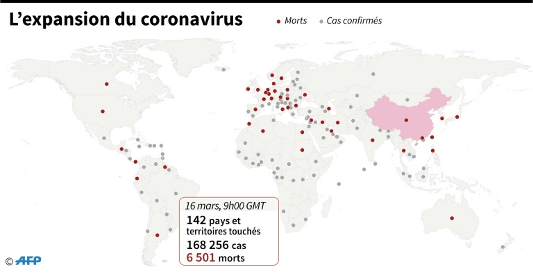 La maladie a fait périr plus de 7.000 personnes, dont 2.158 en Italie, le nombre des contaminations explosant en Europe. Il y a désormais plus de décès recensés ailleurs dans le monde qu'en Chine continentale (3.213), point de départ en décembre de la pandémie et pays le plus touché.
