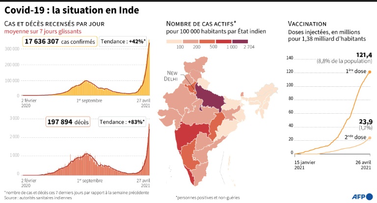 La première cargaison d'aide médicale britannique - 100 ventilateurs et 96 concentrateurs d'oxygène - est parvenue mardi matin à Delhi, la capitale indienne. Neuf conteneurs aériens britanniques chargés d'approvisionnement sanitaire seront envoyés cette semaine. Paris enverra également dans la semaine huit unités de production d'oxygène, des containers d'oxygène et des respirateurs.
