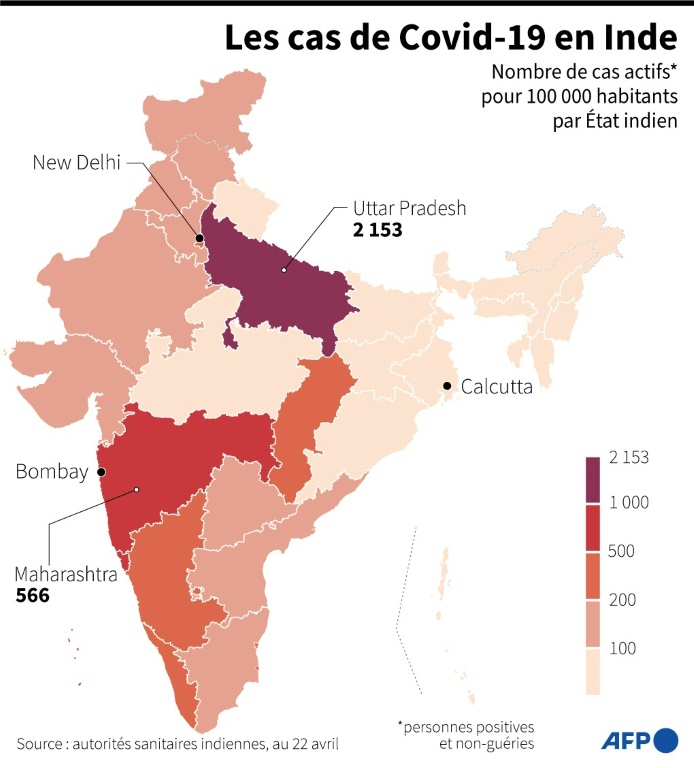 Avec 15,9 millions de cas depuis le début de la pandémie, l'Inde est le deuxième pays le plus touché en nombre de cas devant les 14,12 millions enregistrés au Brésil, désormais sur un plateau très élevé à environ 2.500 décès quotidiens, après plusieurs mois de hausse vertigineuse des décès et des contaminations.