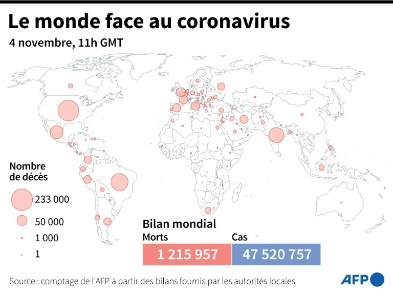 L'Europe est la région du monde où le nouveau coronavirus se propage le plus vite : plus de 11 millions de cas y ont été décomptés, dont la moitié répartis entre la Russie, la France, l'Espagne et le Royaume-Uni. A l'échelle mondiale, la pandémie a fait au moins 1,2 million de morts, les Etats-Unis en recensant le plus (233.650). Le pays a aussi enregistré mercredi un record quotidien de 99.660 cas.