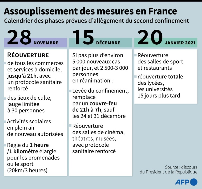 Les commerces ont eu gain de cause et pourront rouvrir dès samedi, première étape d'un déconfinement en trois temps jusqu'au 20 janvier dévoilé mardi par Emmanuel Macron, qui a lancé un appel à la responsabilité pour les fêtes de Noël.