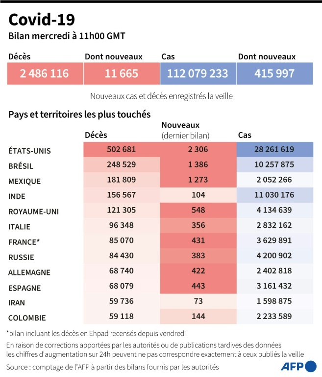 Partout dans le monde, les gouvernements misent sur les injections pour tenter de venir à bout de la pandémie, qui a fait près de 2,5 millions de morts depuis fin décembre, selon un bilan établi par l'AFP mercredi.
