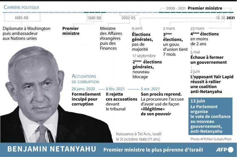 Devant sa résidence officielle à Jérusalem, des manifestants n'ont pas attendu le vote pour célébrer la "chute" du "roi Bibi", surnom de M. Netanyahu qui a été le visage d'Israël depuis son retour au pouvoir en 2009, après trois ans à la tête du gouvernement de 1996 à 1999. "Netanyahu n'a cherché qu'à nous diviser, une partie de la société contre l'autre, mais demain nous serons unis, droite, gauche, juifs, arabes", a déclaré Ofir Robinsky, un manifestant. "C'est bon, c'est fini, il s'en va", a lancé de son côté Gali Israel Tal, une manifestante de 62 ans.