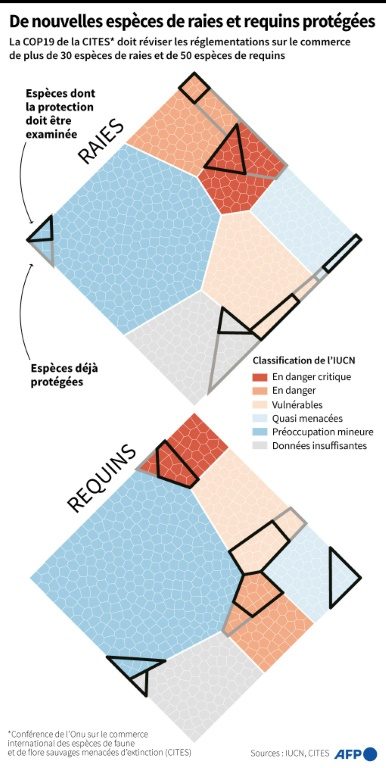 Si les trois propositions sur les requins requiem, requins-marteaux et raies-guitares sont votées, "nous passerions d'un contrôle sur 25% environ du commerce d'ailerons de requins à plus de 90%", avait expliqué à l'AFP au début du sommet Ilaria Di Silvestre, responsable des campagnes européennes pour le Fonds international pour la protection des animaux (IFAW).