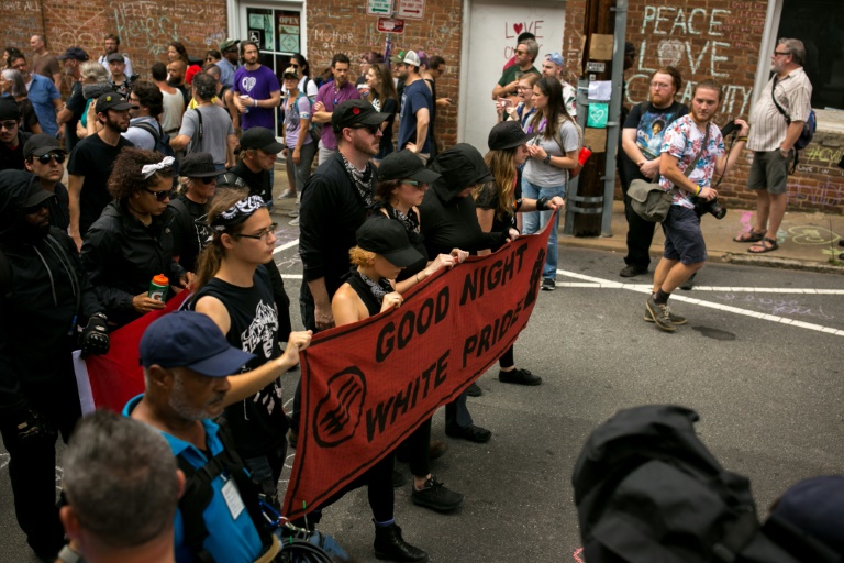 Samedi, quelques dizaines de militants "antifa", vêtus de noir, ont brièvement marché dans ce quartier piéton, encadré de très près par la police. L'un d'entre eux portait une banderole rouge siglée "Good Night White Pride" (bonne nuit fierté blanche).