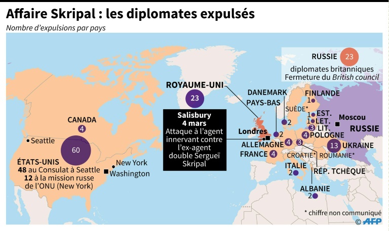 Les Etats-Unis ont annoncé lundi "la plus importante expulsion" d'"espions russe de l'Histoire, dans des représailles coordonnées inédites du camp occidental qui replongent le monde au temps de la Guerre froide en réponse à l'empoisonnement d'un ex-agent russe au Royaume-Uni.