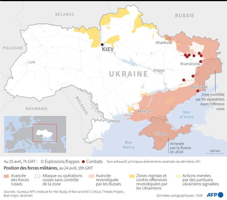 La Russie affiche son objectif de s'emparer de la totalité du Donbass, grand bassin industriel de l'est - que les séparatistes pro-russes contrôlent partiellement depuis 2014 - et de prendre le contrôle total du sud de l'Ukraine, où les combats sont aussi quotidiens.