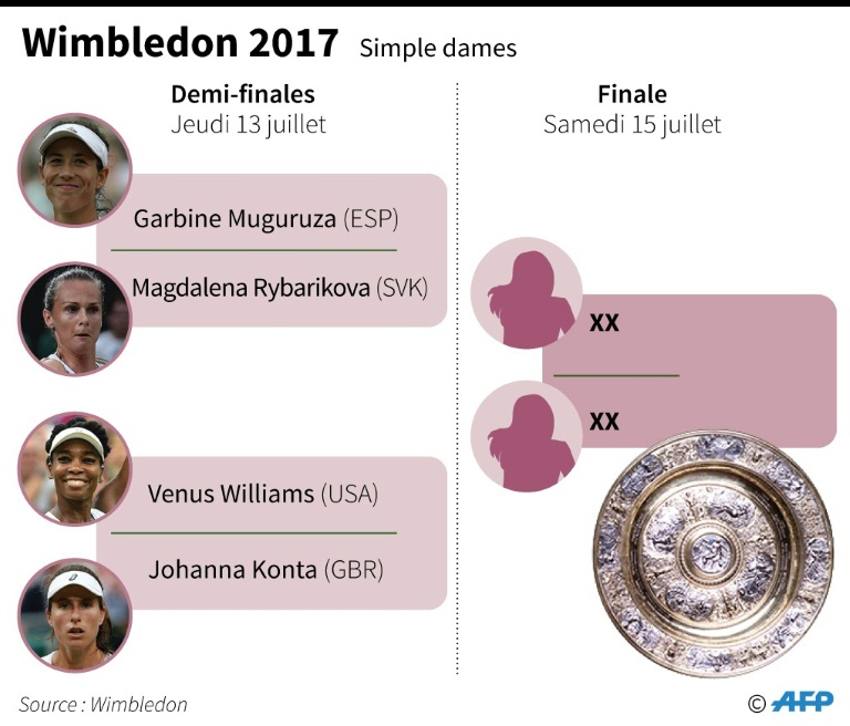 Actuellement enceinte, la détentrice du record de trophées majeures (23) dans l'ère professionnelle ne la stoppera pas cette fois-ci. L'Allemande Angelique Kerber, qui avait mis fin au parcours de Venus en demi-finales l'an passé, est elle déjà éliminée. Mais le prochain obstacle s'annonce périlleux. Car Konta sera soutenue par les 15.000 spectateurs du "Centre court" qui rêvent de la voir succéder à Virginia Wade, dernière Britannique titrée dans le "temple" en 1977.