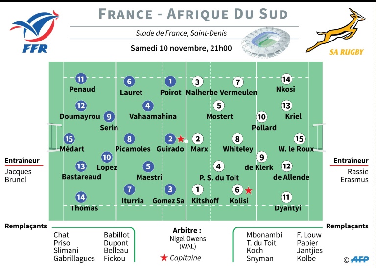 Une entrée épicée: le XV de France débute samedi (21h05) au Stade de France ses test-matches de novembre contre l'Afrique du Sud, ragaillardie et qu'ils n'ont plus battue depuis 2009, pour engranger victoire et confiance sur la longue route jusqu'à la Coupe du monde 2019 au Japon.