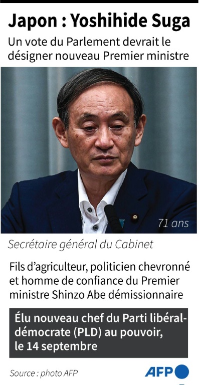 Yoshihide Suga, 71 ans, le nouveau chef du Parti libéral-démocrate (PLD) au pouvoir au Japon, a été élu mercredi nouveau Premier ministre par le Parlement, en remplacement de Shinzo Abe qui se retire pour des raisons de santé.