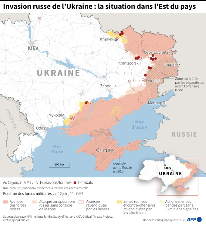"La bataille du Donbass restera sûrement dans l'histoire militaire comme l'une des batailles les plus violentes en Europe", a affirmé le président ukrainien dans son allocution quotidienne lundi soir. "Le coût humain de cette bataille (de Severodonetsk) pour nous est très élevé. Il est juste terrifiant", a-t-il ajouté, insistant sur le besoin désespéré de recevoir ces armements, alors que Kiev fait état de 100 à 300 de ses hommes tués chaque jour.