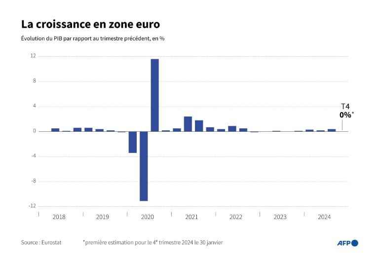 Sur l'année 2024, le Produit intérieur brut (PIB) de la zone euro a augmenté de seulement 0,7% comparé à 2023, après +0,4% l'année précédente, confirmant l'enlisement dans la stagnation d'une Europe déclassée par rapport à la Chine et aux Etats-Unis.