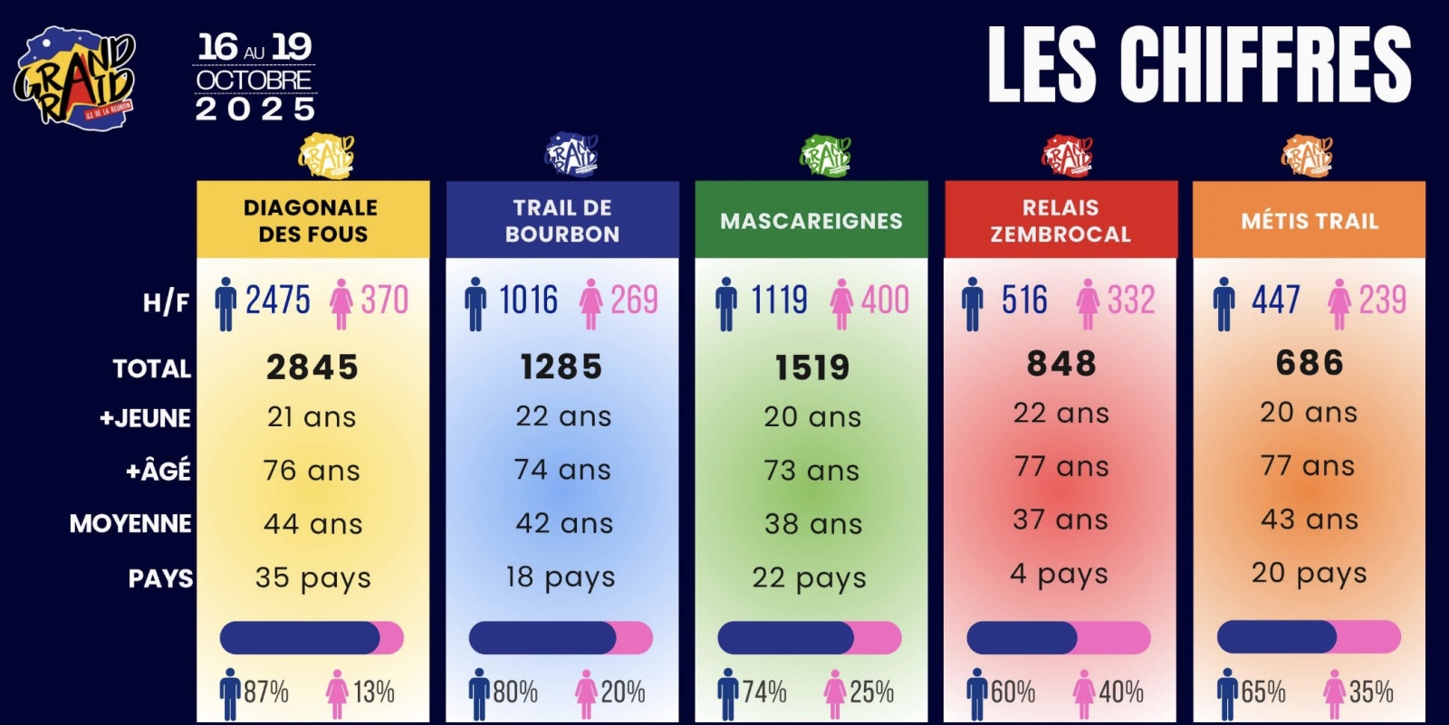 La 36ème édition du Grand Raid se tiendra du 16 au 19 octobre 2025 à La Réunion. L'un des ultra-trails les plus exigeants au monde rassemblera une nouvelle fois des athlètes venus de tous horizons pour affronter les reliefs extrêmes de l’île. 7.183 personnes, 35 pays représentés, des coureurs âgés de 20 à 71 ans...Le Grand Raid voit toujours aussi grand.