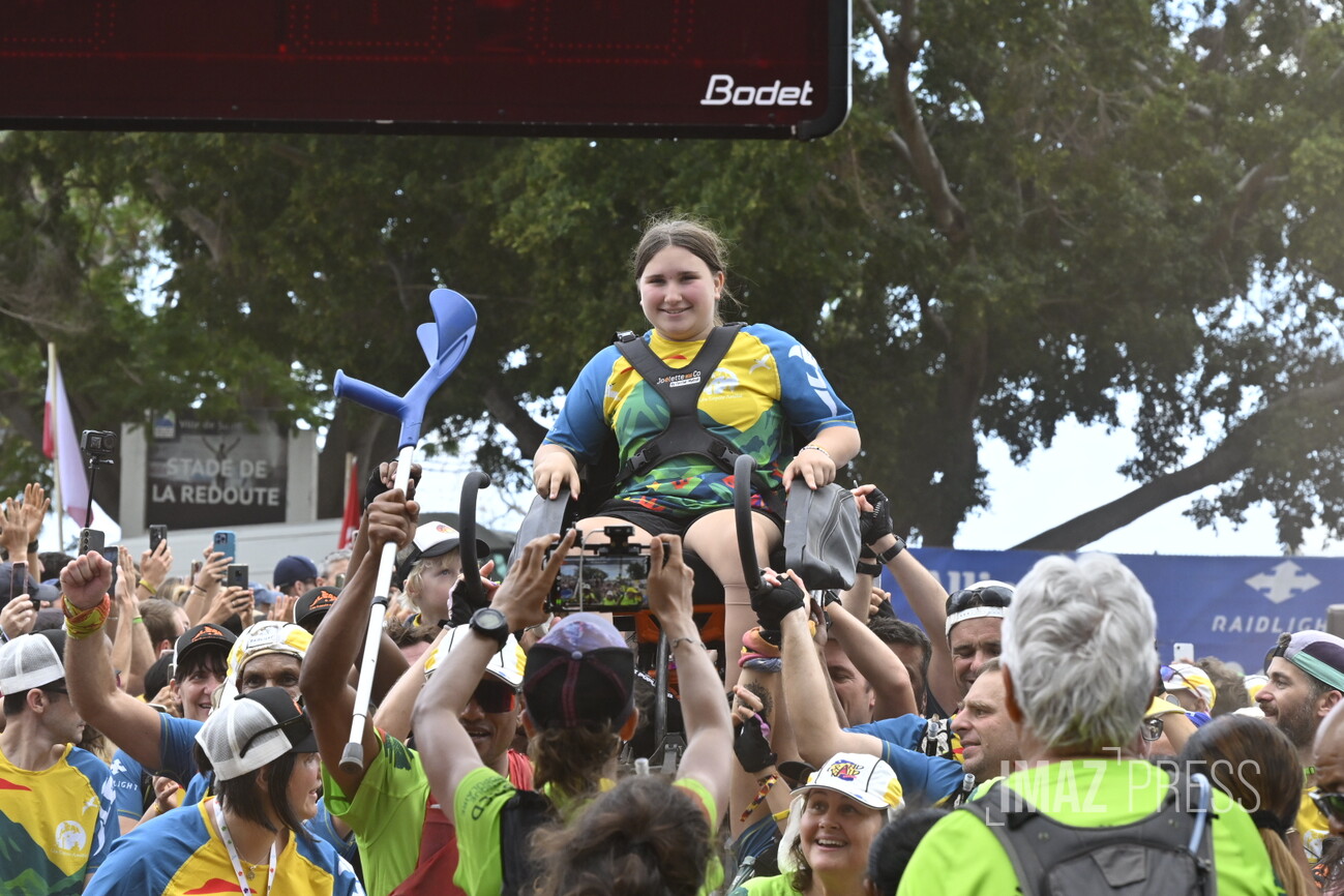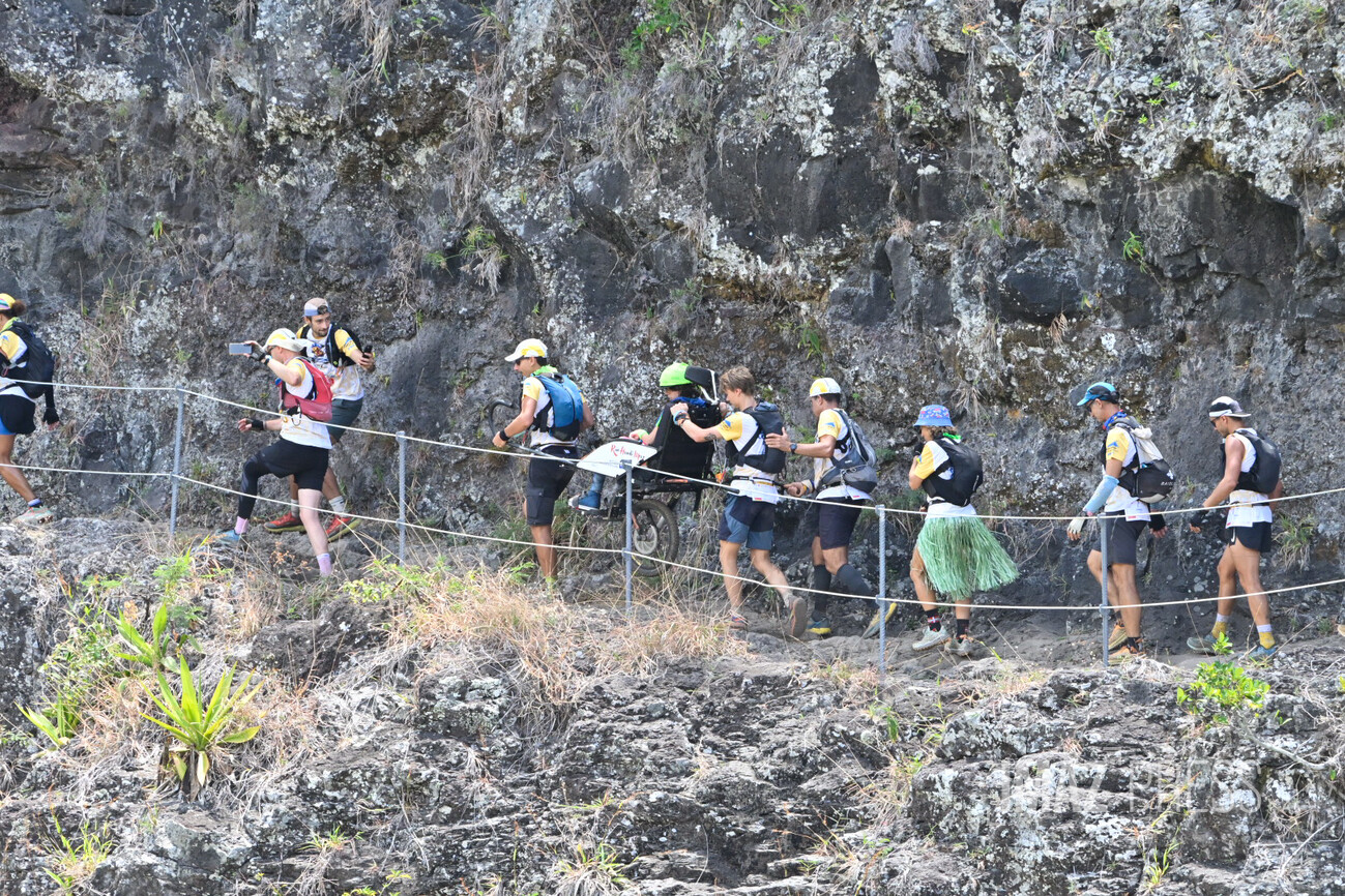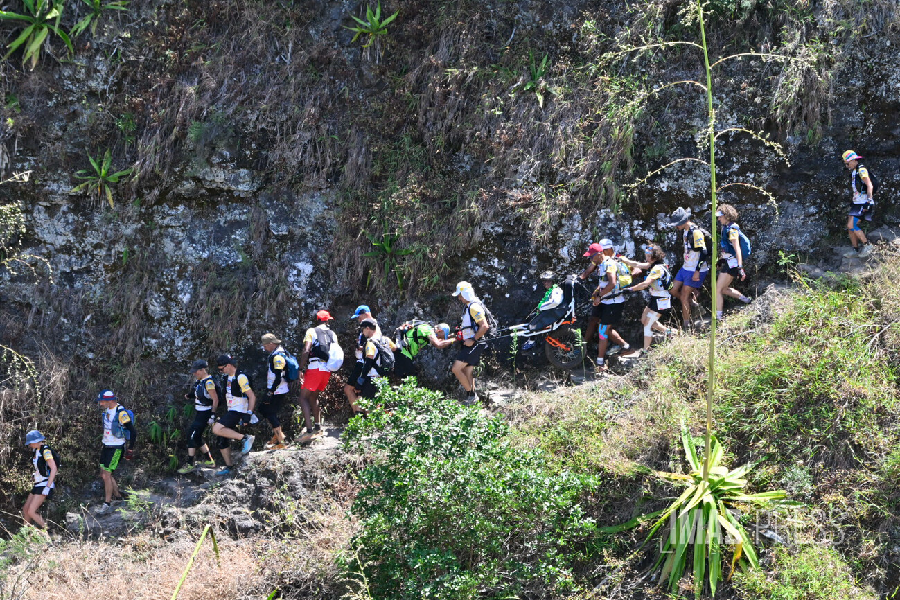 Quelques intants avant lui, ce sont les joëlettes qui ont atteint La Redoute. Ce sont 29 personnes qui ont traversé l'île, portées par 81 coureurs volontaires, grâce aux joëlettes, des fauteuils roulants handisport conçus pour la randonnée.