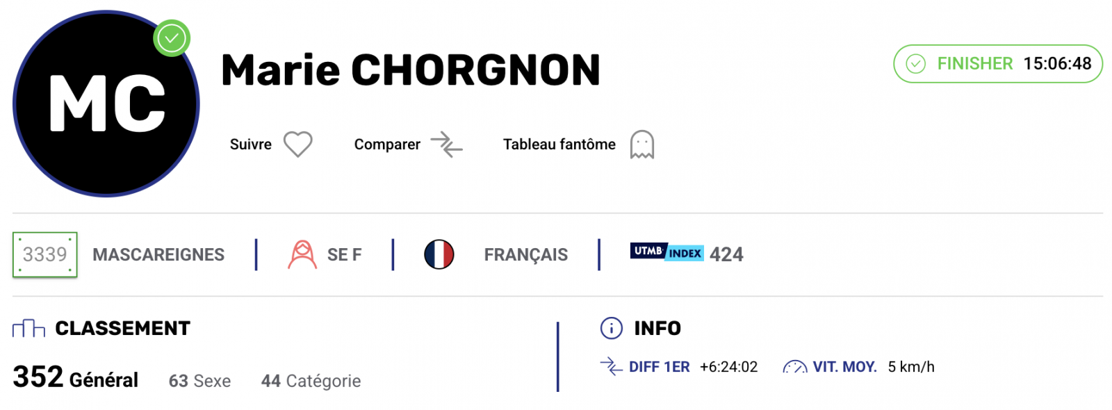 Marie Chorgnon, 28 ans, qui porte le dossard numéro 3339 sur la Mascareignes, a elle bouclé sa course. Classée 352ème au classement général et 63ème femme, la coureuse est arrivée au stade de La Redoute après 15 heures, 6 minutes et 48 secondes de course. Bravo !