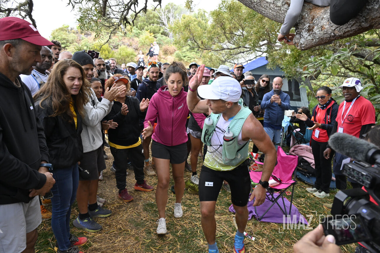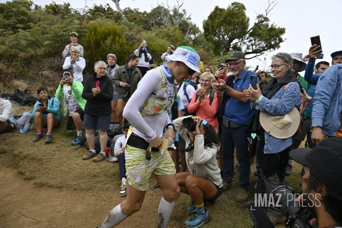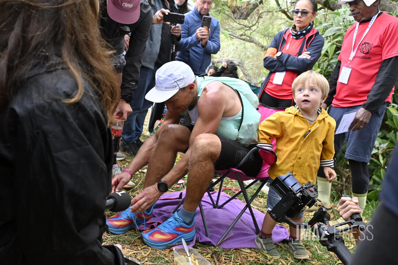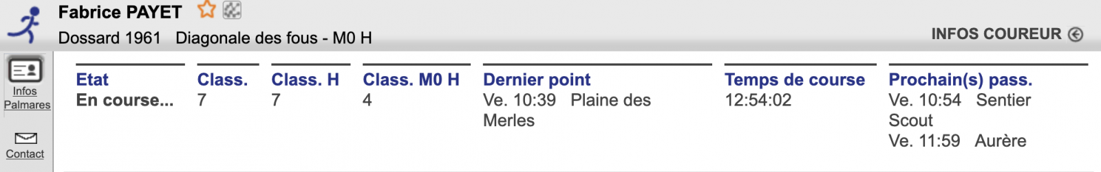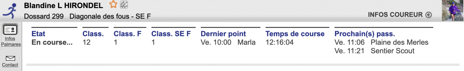 • Vainqueur de la Diagonale en 2021 Ludovic Pommeret, qui fête ses 50 ans, est placé en 5ème position du classement général. Il a pointé au sentier du Taïbit à 8h11. Il a une trentaine de minutes de retard sur le premier