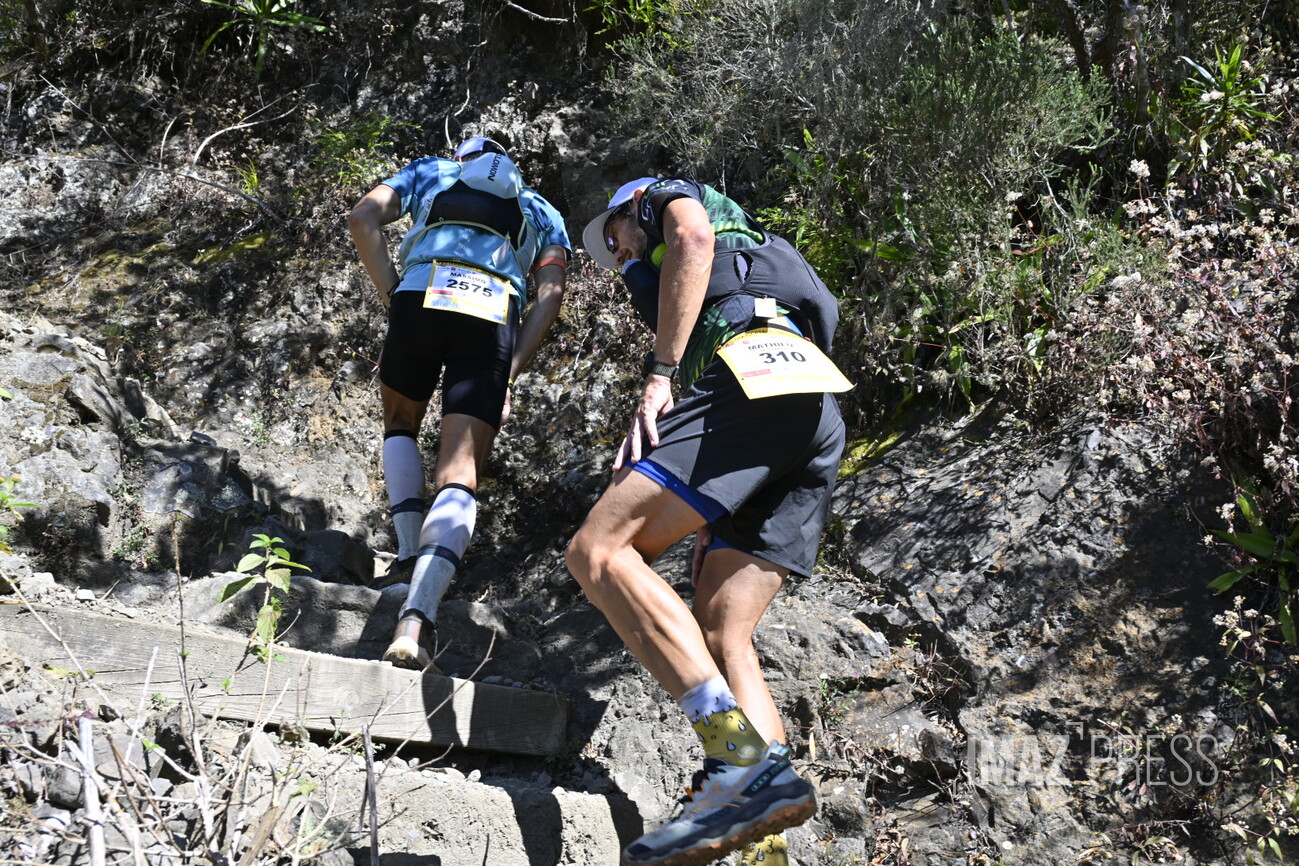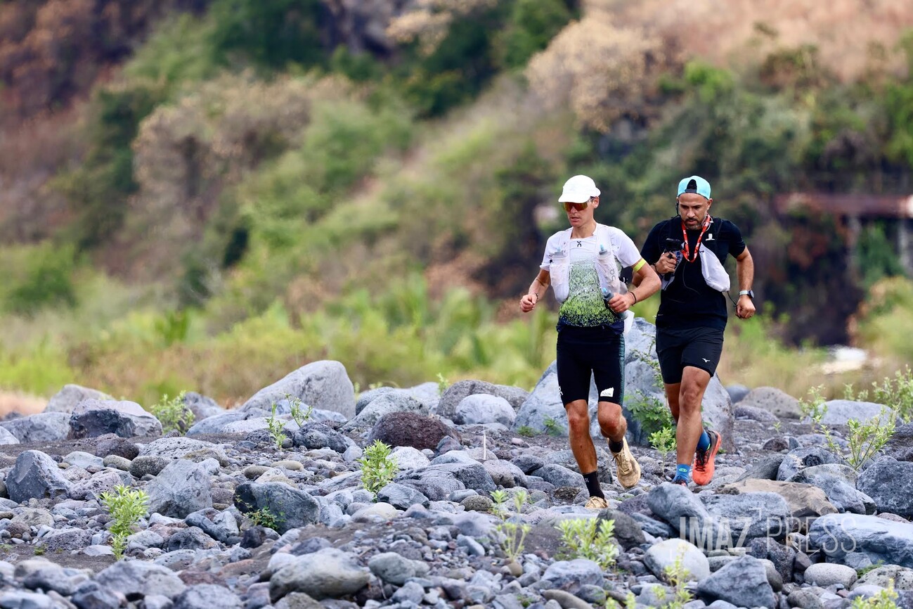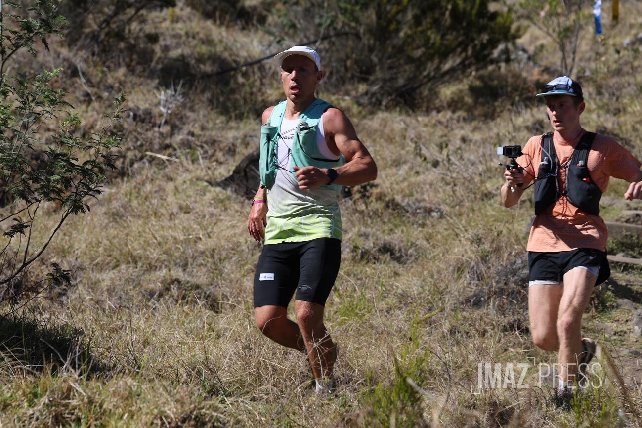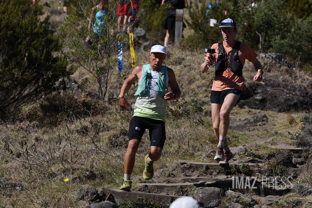 Entre Baptiste Chassagne et Yannick Noël, ça se tire la boure. Les deux sont premiers et deuxième de la Diagonale des Fous. Ils filent direction le Maïdo Tête Dure.
