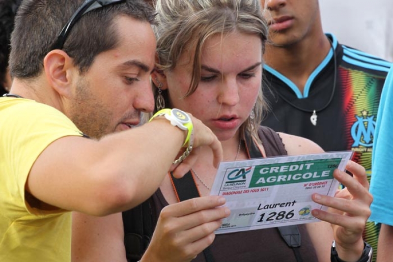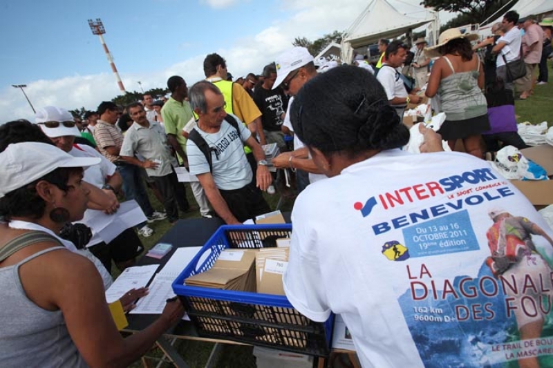 Les Fous et Folles ont leur dossard. Ce mercredi 12 octobre 2011, les quelques 5000 sportifs, confirmés ou non, sont venus récupérer leur précieux sésame pour participer à la Diagonale des Fous, au Trail de Bourbon ou à la Mascareignes. Certains avec le sourire, d'autres un peu plus inquiets, mais tous bénéficiant du soutien de leurs proches. Les Fous s'élanceront ce jeudi 13 octobre à partir de 22h au Cap Méchant à Saint-Philippe. Jusqu'au dimanche 16 octobre, les 2454 raideurs inscrits pour la Diagonale des Fous vont devoir s'armer de courage pour survivre à la course événement. 162 kilomètres et 9600 mètres de dénivelé positif attendent les coureurs, soit l'équivalent de 50 tours Eiffel à parcourir. Un périple que les participants devront boucler en moins de 63 heures s'ils souhaitent faire partie du classement.