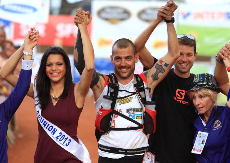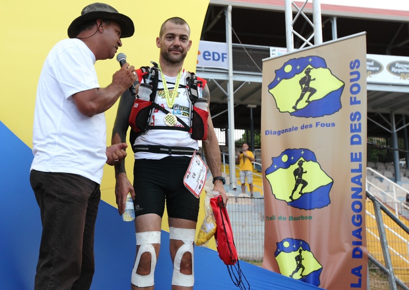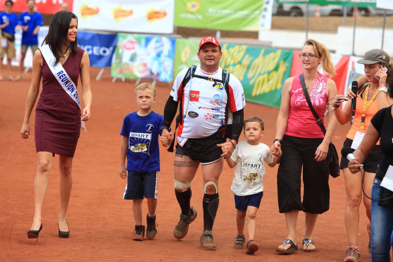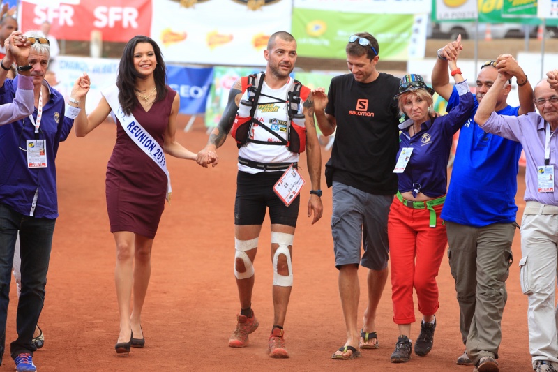 Le dernier raideur est arrivé au stade de la Redoute ce dimanche 20 octobre 2013. Yoannes Dano a terminé le parcours de 163 kilomètres en 65 heures et 13 minutes. Ce militaire a franchi la ligne d'arrivée sur les genoux, mais heureux d'avoir terminé la course. Equipé de son dossard 83, le coureur était accompagné du nouveau Roi des Fous, François D'Haene, du comité d'organisation et de Miss Réunion 2013. Originaire de Bretagne, Yoannes Dano est le 1362ème raideur, celui qui met fin à cette 21ème édition du Grand Raid. (photos Image-Reunion.re)
