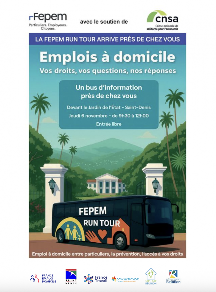 L’équipe de la FEPEM (Fédération des Particuliers employeurs) et ses partenaires dont le Conseil départemental, invitent les bénéficiaires de l’APA (Allocation personnalisée d'autonomie) ou de la PCH (prestationde compensation du handicap) qui emploient une aide à domicile à venir les rencontrer à l’occasion de l’étape du FEPEM Run Tour. Cette étape aura lieu ce jeudi 6 novembre à partir de 9h30, devant le Jardin de l’État à Saint-Denis (Photo d'illustration : rb/www.imazpress.com)