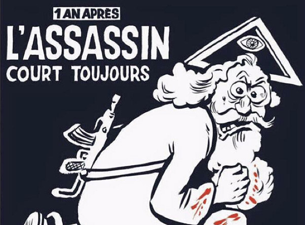 Le journal satirique Charlie Hebdo publie un numéro spécial ce mardi 5 janvier 2015 un an après l'attentat perpétré contre la rédaction le 7 janvier 2015 à Paris. Dans cette attaque terroriste plusieurs personnalités emblématiques du journal - Wolinski, Charb, Cabu, Honoré, Tignous, et Bernard Maris -, avaient été tuées. Ce numéro hommage arbore en première page "un dieu monothéiste à longue barbe, les habits tachés de sang et une kalachnikov en bandoulière, avec le sous-titre : 1 an après, l'assassin court toujours" indique l'AFP.