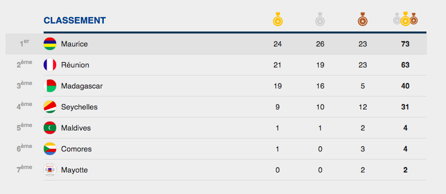 En effet, au cours de la journée, Maurice a mis les bouchées doubles et s'offre une première place, que ce soit en nombre de médailles d'or, ou en nombre de médailles totales.