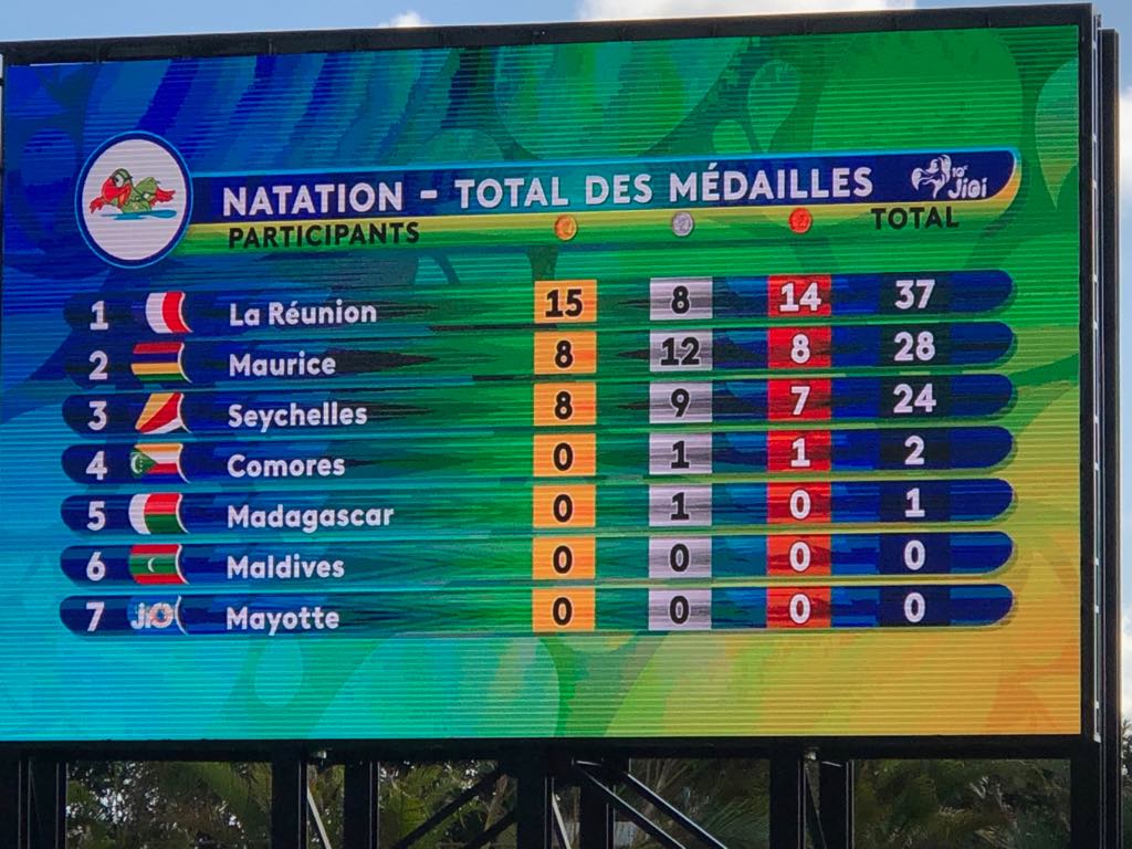 La natation est la discipline qui a rapporté le plus de médailles à la délégation réunionnaise depuis le début de ces jeux des îles 2019. Les nageurs péi devancent largement les nageurs des six autres îles, regardez: