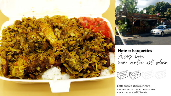 Le cadre est accueillant, la personne au service aussi. Nous repartons avec une barquette de cari ti-jacque poulet fumé, réglée 6 euros. A première vue, les quantités de ti-jacque et de viande sont équilibrées, un bon point. Nombreux sont ceux qui servent du ti-Jacque en quantité largement inférieure à celle de la viande, ce qui n’a aucun intérêt.