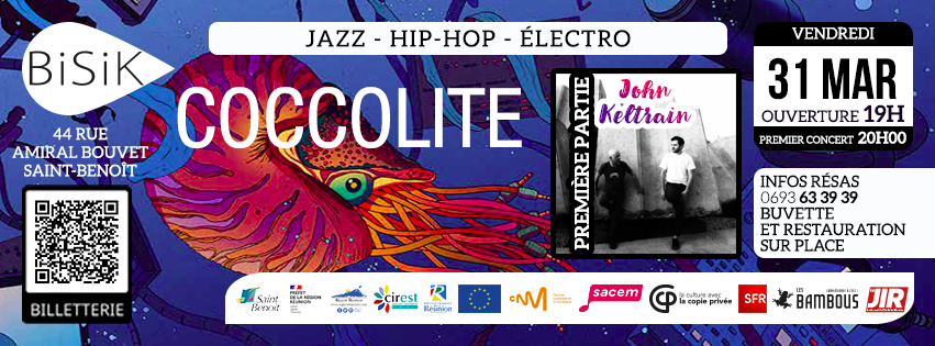 En ouverture de soirée, c'est John Keltrain qui distillera ses créations expérimentales… Après plusieurs années de vie scénique commune, Luc Joly et Brice Nauroy s'offrent - et nous offrent - une nouvelle expérience sans compromis. En seulement quatre ans, un EP et deux albums “Echo” en 2020, ”Live Now” en 2022, le trio Coccolite s’est fait une place à part dans le paysage des groupes émergents. Chacun apportant sa pierre aux projets des deux autres, le claviériste Nicolas Derand originaire de La Réunion, le bassiste Timothée Robert et le batteur Julien Sérié ont développé de longue date cette complicité rare qui fait la force des formations qui comptent.