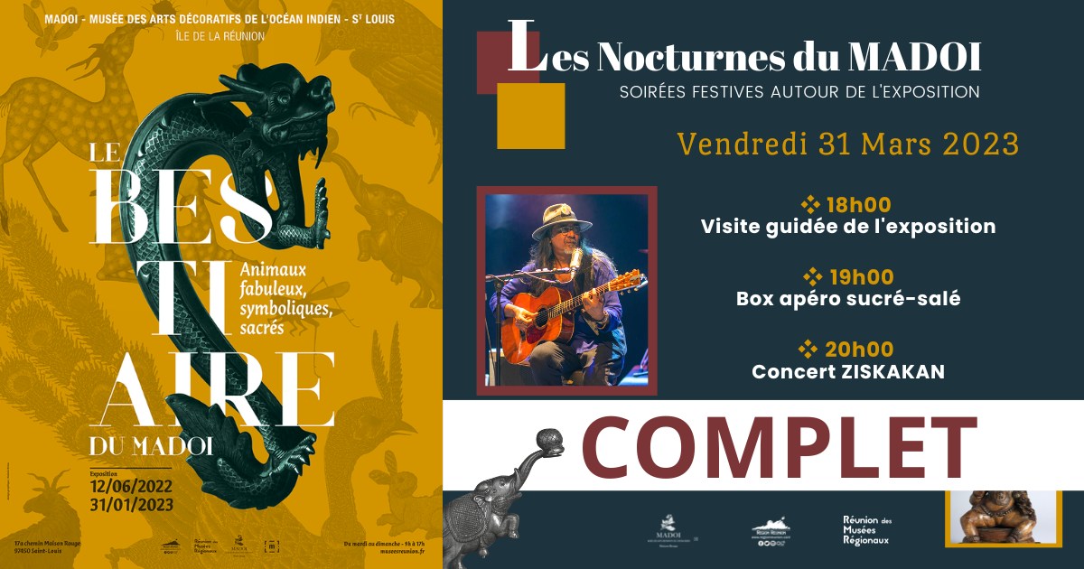 Chaque mois, le Musée des Arts Décoratifs de l’Océan Indien vous accueille pour une soirée artistique en lien avec l'exposition. En mars, le musée résonne aux sonorités du mythique groupe Ziskakan avec au programme visite guidée de l’exposition à 18h, box-apéro à 19h et concert à 20h.