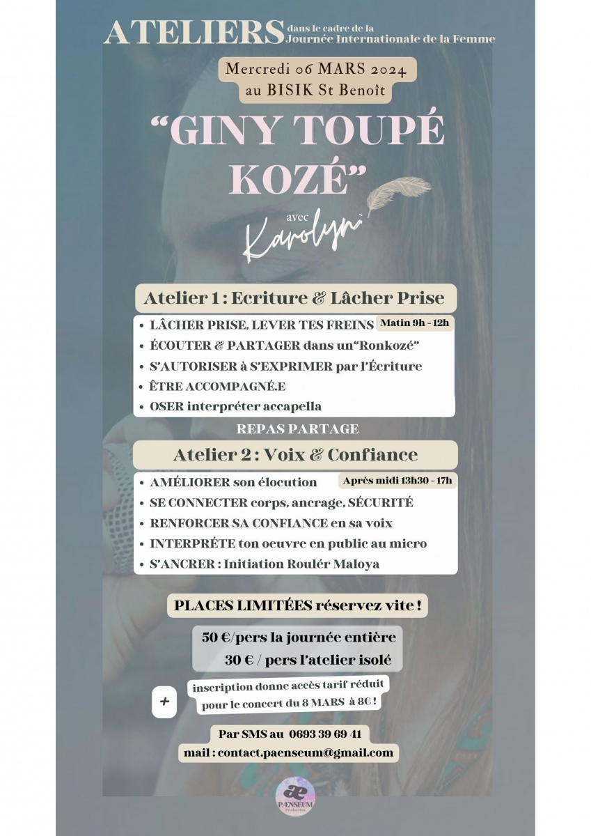 Un deuxième atelier sera animé par Karolyn intitulé voix & confiance se déroulera de 13h30 à 17h00 :